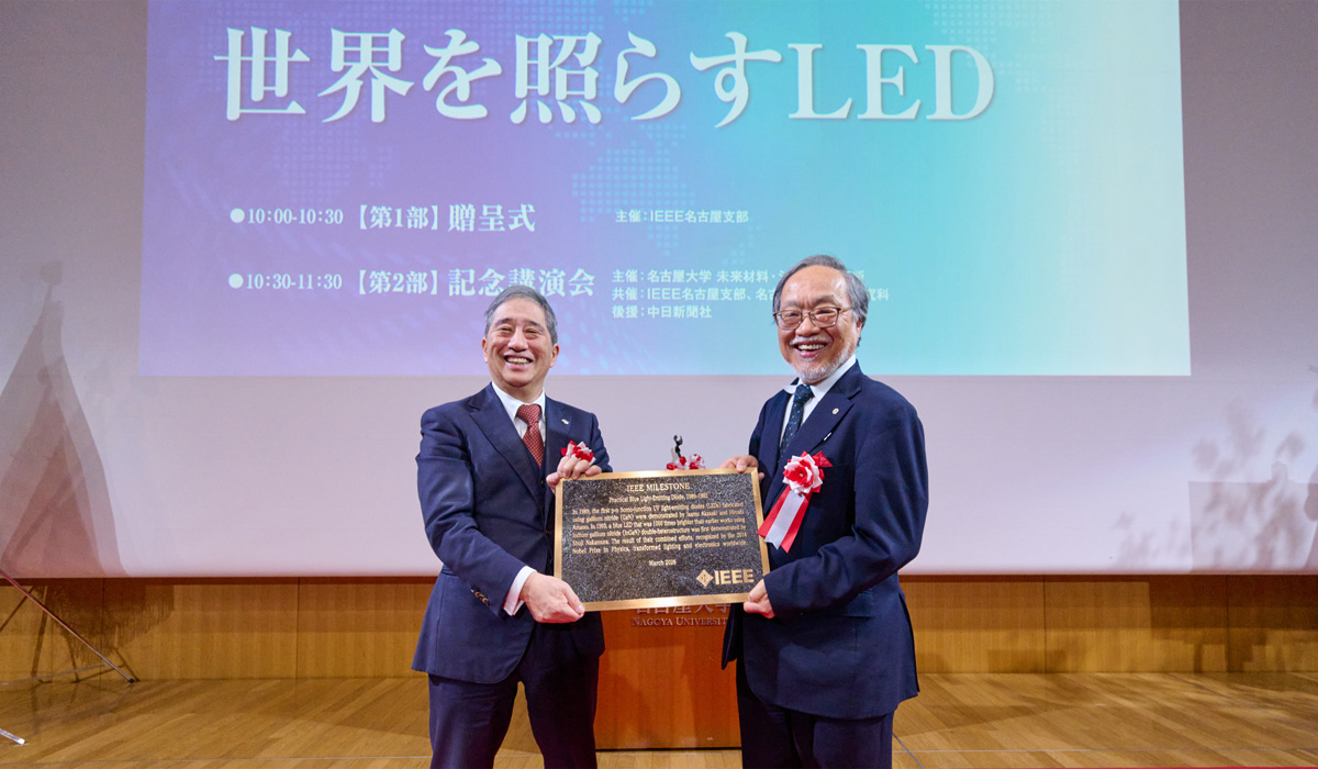 「青色発光ダイオード(青色LED)」の研究業績が、高効率な白色光源による省エネルギーの実現、環境負荷の低減への貢献など、イノベーションをもたらした発明とされ、IEEEマイルストーンの認定を受けました。この認定を記念して、2026年3月23日(月)、名古屋大学ES総合館1階ESホールにて、IEEEマイルストーン認定記念式典「世界を照らすLED」を行いました。