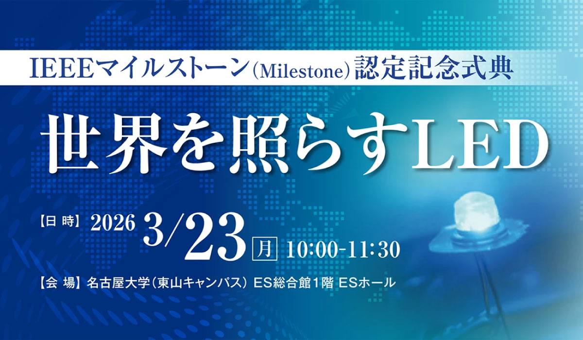 名古屋大学 赤﨑勇特別教授(故人)、天野浩教授および米国 中村修二教授による「青色発光ダイオード(青色LED)」の研究業績が、高効率な白色光源による省エネルギーの実現、環境負荷の低減への貢献など、イノベーションをもたらした発明とされ、名古屋大学としては初めてIEEEマイルストーンの認定を受けました。これを記念して、IEEEマイルストーン認定記念式典「世界を照らすLED」を開催します。