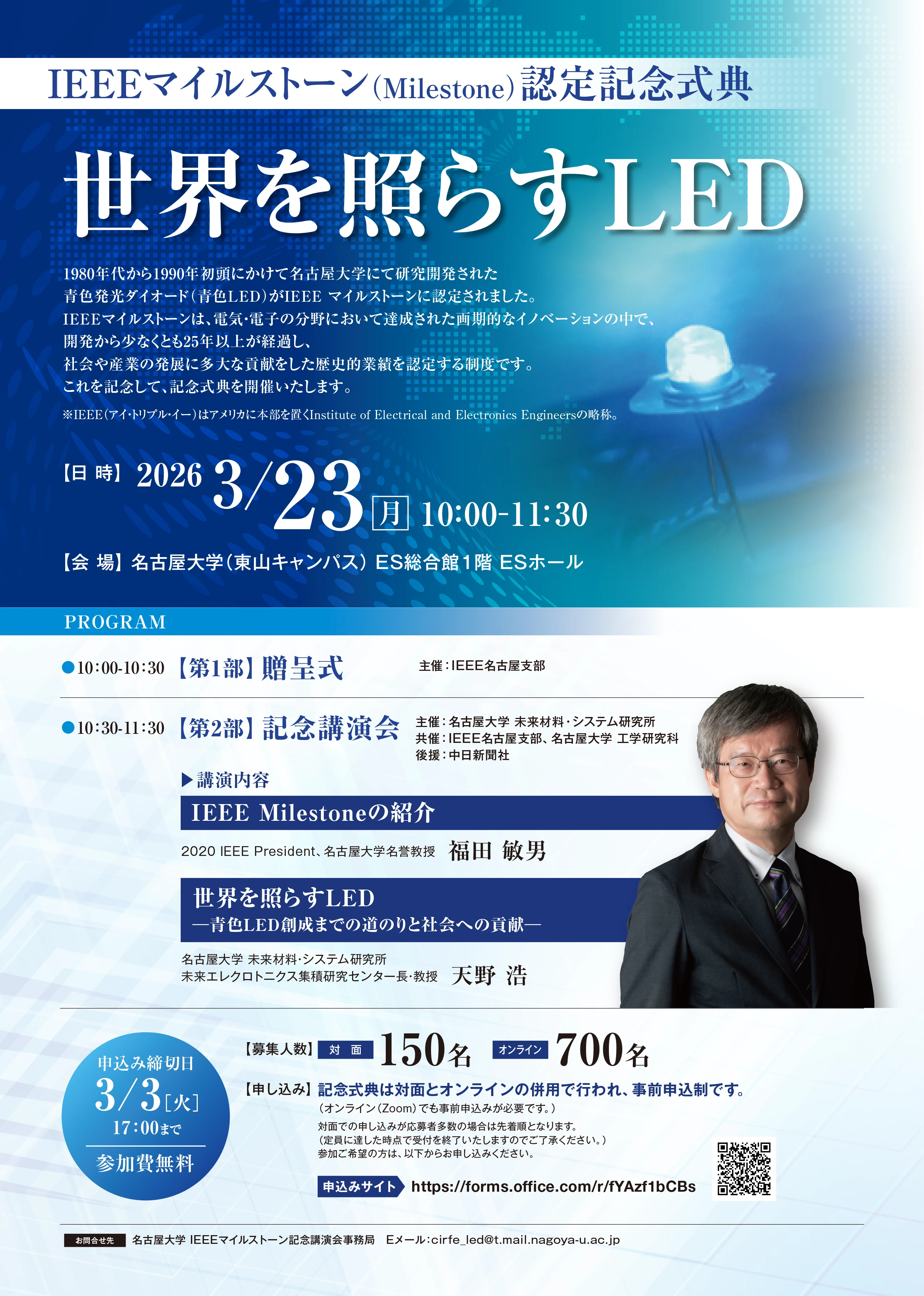 1980年代から1990年初頭にかけて名古屋大学にて研究開発された青色発光ダイオード(青色LED)がIEEE マイルストーンに認定されました。